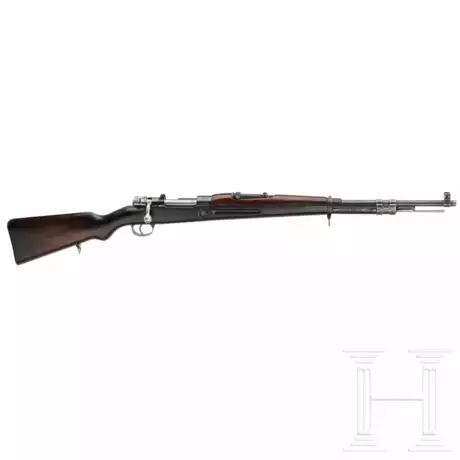 Cal. 7,65x53Arg, SN. 27720, nummerngleich. Rauer Lauf, Länge 59 cm. Visier skaliert 2 - 20. Fünfschüssig. Gültiger belg. Beschuss. Hülsenkopf mit peruanischem Wappen und Umschrift "República Peruana", rechts "Modelo 1935", an der Führung FN-Firmierung. Originale Brünierung, dünner an den Beschlägen, Magazindeckel feinnarbig, Lauf unter dem Handschutz mit gereinigten Narben, ebenso der Visiersockel. Verschluss grau. Dunkler Nussholzschaft mit Tragespuren, beide Riemenbügel und Putzstock. Länge 110 cm.