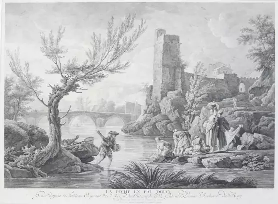 Peche en eau douce. Kupferstich v. Venu nach J. Vernet, um 1780. ca. 39 x 46 cm. - Links oben kl. Braunfl. und einige kl. Löcher, ansonsten prachtvolles, sehr dekoratives und seltenes Blatt.