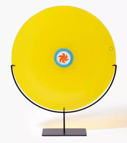 Serie "Pianeti", Entwurf 1983. Farbloses Glas mit gelbem Überfang, im Spiegel blaue und orange Einschmelzungen. Unterseitig signiert und datiert "venini Laura 1983/08" (graviert). Herstelleretikett. D 37 cm. Geschwärztes Metallgestell.