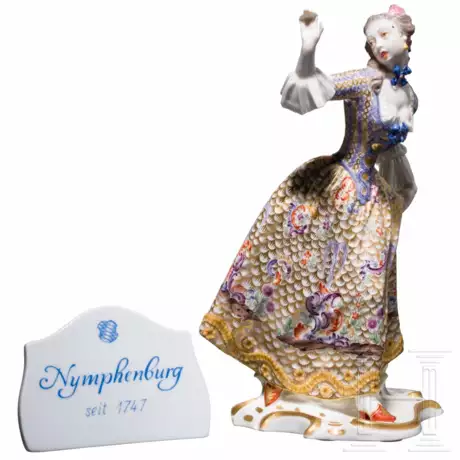 A porcelain figure "Leda" from the Italian Commedia dell'arte, Franz Bustelli (design), Nymphenburg, 20th century (finish), and a porcelain shield "Nymphenburg"