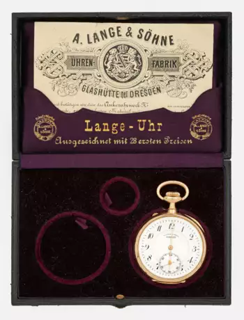 Glashütte b. Dresden, 1901-1907. Roségold, gest. 750. Halboffenes, glattes Gehäuse mit breiter Lünette. Goldcuvette. Weißes Emailzifferblatt mit arabischen Indexen, kleiner Sekunde, vergoldeten Birnzeigern und Herstellersignet. Vergoldetes 3/4-Platinenwerk mit Kronenaufzug, gravierter Unruhkolben mit Schwanenhals-Feinregulierung, Kompensationsunruh mit Breguet-Spirale und Ankerhemmung. Platine sign.; Werknr. 47120. Original-Schatulle mit Ersatzglas und -spirale und Garantiekarte. D. ca. 50 mm. Gew. ca. 95,56 g.