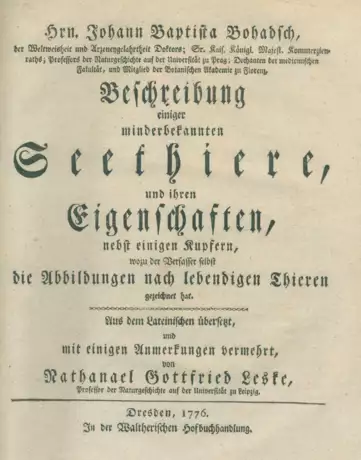 BM, Natural History I, 187 - Nissen ZBI 443 - Dean I, 145.- Erste deutsche Ausgabe (erste lat. Ausgabe. "De quibusdam animalibus marinis" v. 1761) dieser Untersuchung zur Mittelmeerfauna, speziell über Hohl- und Weichtiere. J. B. Bohadsch (1724-1768) war Professor für Naturgeschichte an der Universität von Prag. Diese vermehrte und berichtigte posthume deutsche Ausgabe besorgte der Naturhistoriker und Ökonom R. G. Leske (1751-1786), der auch die Anmerkungen vielerorts berichtigte und ergänzte.- Mit Abschnitten u.a. über Lernea, Kerbenmaul, Argus, Zitterblase, Spritzwürmer, Seefeder, Seescheide, über die Eier des Rochen und der Tintenfische.- Innenfalze neu verstärkt, Ebd. etw. berieben, Rücken tls. restauriert, sonst sehr gutes und sauberes Exemplar.