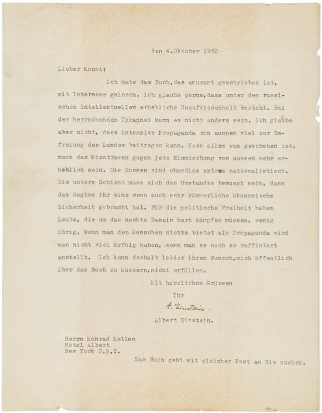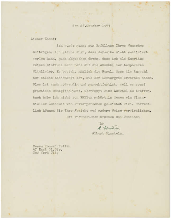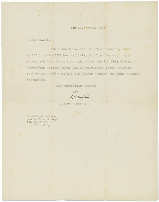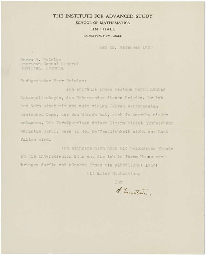 [Includes:] Typed letter signed ("A. Einstein") to H. Heisler, Princeton, 28 December 1935. In German. One page, 254 x 203mm. A letter of reference for Konrad Katzenellenbogen noting that he is the son of "a German lady who has been a friend of ours for many years," and wishes to settle in the United States. Einstein attests that his parents, who had already come to the U.S. have the means to ensure he would not be a "financial burden to the public." He then fondly recalls the time he spent at Heisler's home when he came to Bermuda in May of 1935 in order to gain his U.S. citizenship. * Typed letter signed ("A. Einstein") to Konrad Kellen, Princeton, 4 October 1950. In German. One page, 280 x 125mm (light toning, marginal wear). Einstein thanks Kellen sending "the book, which is amusingly written, with interest." Musing that there must be "considerable dissatisfaction among Russian intellectuals," given the oppressive regime in the Soviet Union. He concedes that considering "everything that has happened, the mistrust of any outside interference must be very considerable," adding that the Russians tended toward nationalism regardless." Despite his agreement with the overall tone of the book, Einstein declined to comment on it publicly. * Typed letter signed ("A. Einstein") to Konrad Kellen, Princeton, 15 February 1954. In German. One page, 279 x 215mm (pinholes at fold intersections, light foxing). Einstein thanks Kellen for an article relative to Kellen's work with defectors from the Eastern Bloc, adding that his points had applicability beyond those "behind the Iron Curtain." * Typed letter signed ("A. Einstein") to Konrad Kellen, Princeton, 24 October 1954. In German, One page, 279 x 215mm (marginal wear, light foxing). Einstein expresses his inability to fulfill Kellen's request [apparently to secure a temporary fellowship at the Institute for Advanced Study], noting that as a emeritus faculty, he had little influence. He adds that selection was limited to those who had obtained doctoral degrees, and that he had never heard of an instance where a private individual received financial support. * Photograph, inscribed and signed in the lower margin: "To Mr Konni Kellen, A. Einstein 55". 252 x 202mm. (Some abrasions at margins affecting several words in inscription, several pencil marks at margins).
