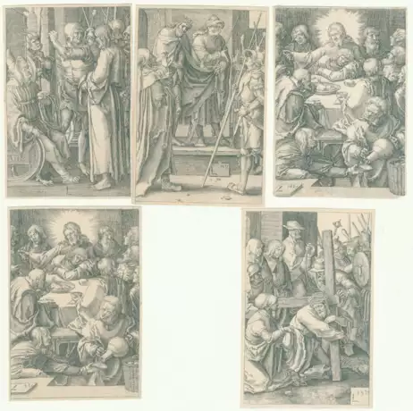 Nach B. 43-56 u. Hollstein (Engravings after van Leyden) 42-55. Enthält die Blätter Abendmahl (2), Christus vor Annas, Ecce Homo u. Kreuztragung. - Ränder unterschiedl. beschnitten, 1 Bl. mit ger. Eckabschn. unten re.