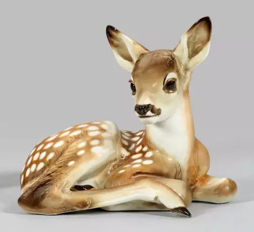 Naturalistische Darstellung eines aufmerksam beobachtenden Rehkitzes mit aufgestellten Ohren und fein reliefierter, gefleckter Fellzeichnung. Polychrome Unterglasurmalerei. Entw. Prof. Theodor Kärner. Bez. "T. Kärner". Modell-Nr. 41. Minim. rest.; Manufakturmarke. H. 16 cm. B. 18 cm.