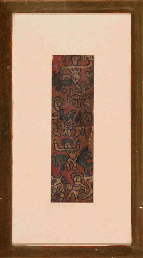 Ägypten, 5.–8.Jh. Wolle und Leinen, teils polychrom eingefärbt. Bestand: Textil mit menschlichen Figuren, Grosskatze und anderen Tieren. 27,5x8 cm. Gerahmt. / Bortenfragment mit Figuren, eingerahmt von Laufendem Hund-Band. 14x11,5 cm.