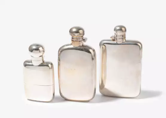 Silber. (1) London, 1919, (2) Birmingham, 1911, mit integriertem Becher, (3) Chester, 1916. Blanke, gerundete Rechteckformen mit Bajonettverschluss. Garantiemarke, Feingehalt 925. H 9–12 cm, zus. ca. 297 g.