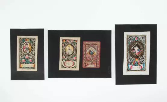 Süddeutsch, 18.Jh. Pergament geschnitten, gestichelt und genadelt, partiell gouachiert. Zentrale Gouacheminiaturen. Hl. Aloisius, Hl. Georg, Hl. Sabina und Maria Hilf. 3 Schriftbänder und 1 Schriftkartusche. Ästchenchnitt mit Blumen. H 7,5–10 cm bzw. B 4,5–5,5 cm (Schnitt). Ungerahmt.