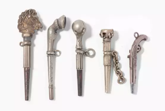 England, 19.Jh. Silber/Metall. In Form von Pistole, Pferdekopf, Kralle mit Kugel, Pferdehufe und eines mit rotem Glasbesatz.