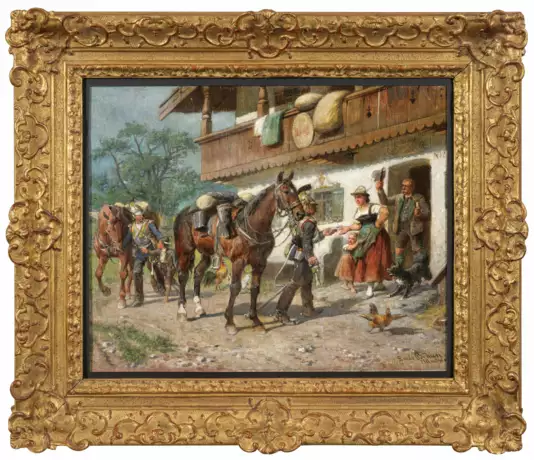 Ein Kürassier überreicht den Bewohnern eines Bauernhauses den Befehl zur Einquartierung, den diese bereitwillig und freundlich grüßend entgegennehmen. Szenen aus dem Soldatenleben, bei denen die detailgenaue und korrekte Wiedergabe von Uniformen und Ausrüstung sowie realistische Pferdedarstellungen im Mittelpunkt stehen, waren das Spezialgebiet von Louis Braun, der nach dem Studium der Historienmalerei bei Horace Vernet in Paris als Kriegs- und Soldatenmaler große Popularität erlangte. Vom deutsch-dänischen Krieg 1864 über den deutschen Krieg von 1866 bis zum deutsch-französischen Krieg von 1870/71 hat er sämtliches Kriegsgeschehen beobachtet und in zahlreichen Gemälden verarbeitet. Öl/Lwd.; R. u. sign. und ortsbez. "München". Verso auf dem Keilrahmen betitelt und dat. 1903. Rest.; 35,5 cm x 44,5 cm. Rahmen.