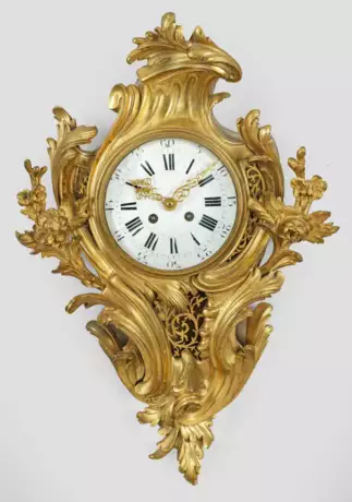 Bronze, vergoldet. balusterförmiger, asymmetrisch angelegter Korpus aus üppigem Rocaille und ornamental angelegtem Gitterwerk. Verglastes, rep. Zifferblatt. Pendulenwerk mit fadenaufhängung sowie Halbstundenschlag auf Glocke. H. 54 cm.