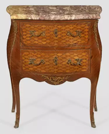 Palisander und Rosenholz, furniert. Dreiseitig bombierter Korpus, flankiert von schlanken Ecklisenen, in hohe, geschweifte Beine übergehend. In der gegliederten Front zwei Schubladen. Flächendeckend breit gerahmte Furnierfelder aus Gitterwerk. Schlagstempel DAIDEF. Gering überstehende Deckplatte aus beigefarbenem, violett gemasertem Marmor. Altersspuren. H. 85,5 cm. 73 cm x 37 cm.