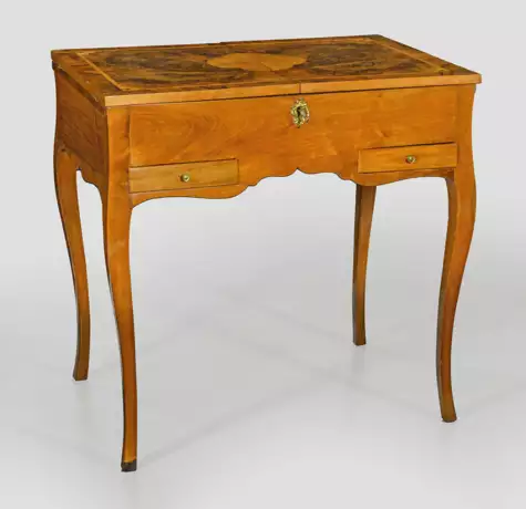 Nussbaum und Nussbaummaser, massiv und furniert. Gerader Zargenkasten auf geschwungenen Beinen. In der Front zwei kleine Schubfächer. Gering überstehende aufklappbare Deckplatte. Unterhalb Ablageflächen sowie aufstellbare Spiegelfläche. H. 70 cm. 70 cm x 48,5 cm. Beiliegend Expertise.