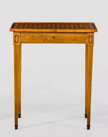 Rosenholz, furniert. Gerader Zargenkasten auf hohen, konischen Beinen. Rechteckige Deckplatte mit schmaler Galerierahmung. In der Front Schubfach mit Schreibfläche und Facheinteilung. Allseitig breit gerahmte Furnierfelder aus Gitterwerk. H. 73 cm. 61 cm x 42,5 cm.