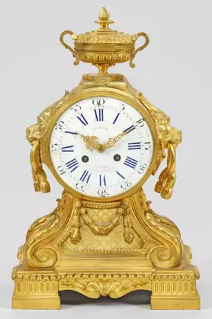 Bronze, vergoldet. Über gekantetem Sockel geschweift ansteigende Basis aus eingerollten Voluten und Gitterwerk als Träger für rundes Uhrengehäuse, flankiert von plastischen Löwenmaskarons mit Vasenbekrönung. Verglastes, besch. Emailzifferblatt, bez. Gasnier à Paris. Pendulenwerk mit Pendelfeder sowie Halbstundenschlag auf Glocke. Platine bez. LaGarde à Paris. H. 41 cm. 25 cm x 14 cm.