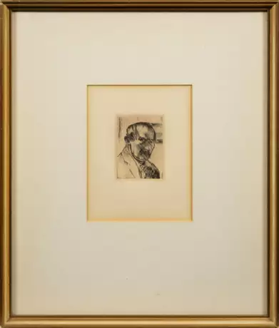 Radierung/Papier, 1919. Das Motiv ist eine Detailherauslösung aus dem größeren Blatt "Im Atelier" für das Buch "Von Corinth über Corinth" (1921, Frontispiz). Wvz. Schwarz Nr. 380 XII. Plattenmaß 10,6 xm x 8 cm. Rahmen.