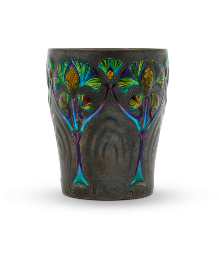 A PARTIALLY HAMMERED SILVER-LEAF DECORATED AND ENAMELLED SILVER CUP BY LUCIEN HIRTZ, CIRCA 1910