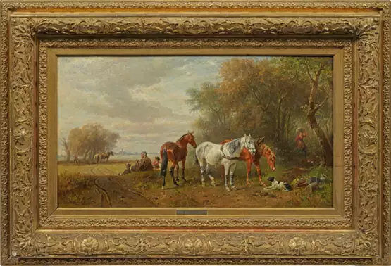 Am Feldrand lagerndes Paar mit Hund, das in eine weite Landschaft mit tiefem Horizont blickt, dicht daneben Arbeitspferde am Waldesrand. Atmosphärisch gestimmte Landschaftsstaffage. Motiv- und stiltypisches Werk des Künstlers, der sich mit Hingabe dem Studium von Pferden widmete und diese in vielen lebendig wirkenden Bildern darstellte. Bevorzugt schilderte Hartmann ländliche Arbeitspferde, Ernteszenen, Pferdemärkte, Fuhrleute und Treidler. Hartmann, der an der Münchner Akademie studierte, trat erstmals 1860 erfolgreich mit einem Pferdebild hervor und zeigte sie fortan auf vielen bedeutenden Ausstellungen. Öl/Lwd.; L. u. sign. und dat. 1895 mit Ortsangabe München. 46,5 cm x 84 cm. Rahmen.