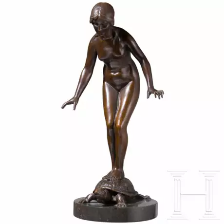 Bronze, braun patiniert. Weiblicher Akt, auf dem Rücken einer Schildkröte balancierend. Auf rundem Marmorsockel. Unsigniert. Höhe 33,3 cm (Figur), Gesamthöhe 36 cm.