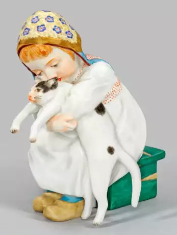 Auf einem Bänkchen sitzendes kleines Mädchen in weißem Kleid mit gepunktetem Latztuch und goldgesäumtem, blütengemustertem Käppchen, eine Katze liebkosend. Polychrome Aufglasurmalerei. Entw. Konrad Hentschel. Modell-Nr. 73367. Schwertermarke. H. 12,5 cm.