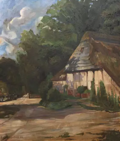 Lot 40 | Maler 20. Jh. "Hütte am Waldrand", Öl/ Lw., undeutl. sign. u.l. und dat. ´23, 70x58 cm, Rahmen