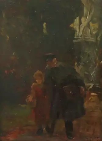 Lot 1927 | Maler des 19. Jh. ''Auf dem Weg zum Einkauf'', Vater und Tochter mit K…