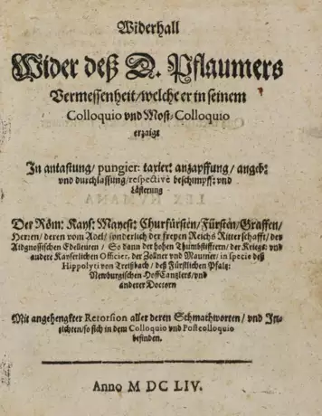 Jöcher III,123. - Streitschrift aus dem literarischen Könflikt über die Behandlung von Schuldern zwischen Manz und dem Überlinger Bürgermeister Pflaumer. Manz konnte die Fehde für sich entscheiden. Vgl. ADB XX,281ff.