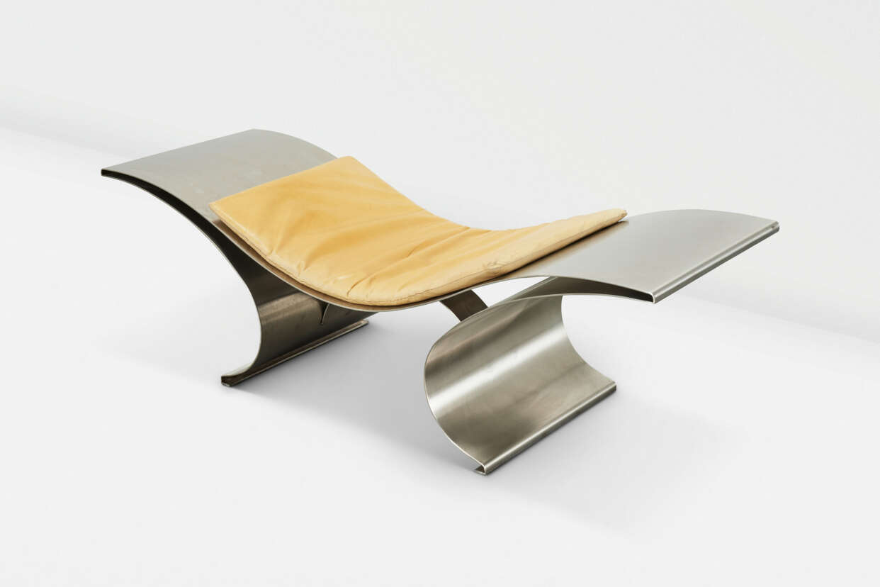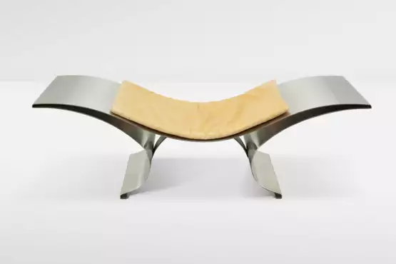 Acier inoxydable brossé plié ; coussin en simili cuir / folded brushed stainless steel ; leatherette cushion