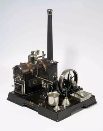 Göppingen, um 1920. Mit Firmensignet "GM&Cie.". Blech, Eisen und Messing brüniert. Dampfkessel mit Kamin und Brenner. Zylinder und Schwungrad auf handlackiertem Gusssockel. 34x28x43 cm. Mit diversem Zubehör und originaler Holzkiste.