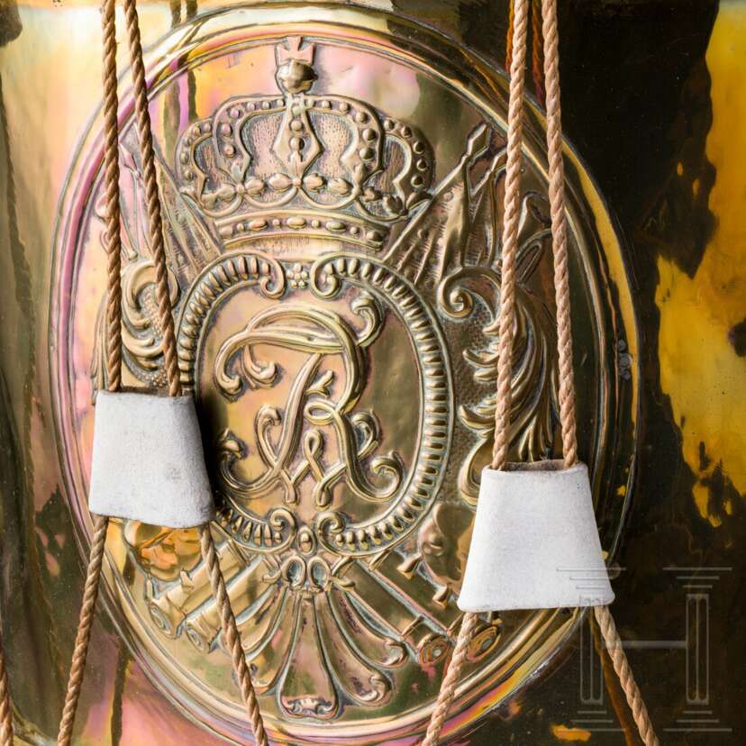 Große Messingtrommel (kleine Dellen), schauseitig ein ovales Trophäenblech, darauf die Chiffre "FWR" unter Krone. Rot und weiß bemalte Holzreifen. Alte Felle (vereinzelt kleine Fehlstellen, Altreparatur). Seile später ergänzt, die Lederteile daran alt und nachgeweißt. Partiell leicht beschädigt, Altersspuren. Höhe 40 cm, Durchmesser 40 cm.