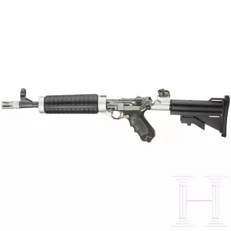 Kal. 9mmLuger, Nr. 2588, nicht nummerngleich, spiegelblanker, sechszügiger Lauf, Länge 280 mm, mit Mündungsbremse 330 mm. Deutscher Beschuss 1997. Als Visierung montiert ein G3 Korn mit entsprechendem Drehvisier, skaliert 1 - 4. Tiefschwarze Brünierung, mattiert am Lauf. Schwarzer Kunststoff-Vorderschaft mit Montagekomponenten aus Aluminium verbaut. Einschiebbarer Kolben ebenfalls mittels Aluminiumzwischenstück am Griffstück verschraubt, ohne Werkzeug nicht abnehmbar. Schwarze Kunststoffgriffschalen mittels HOGUE Griffadapter verstärkt.