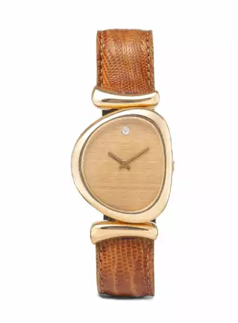 Massives 750 Gelbgold-Gehäuse, 30x34 mm. Quarzwerk. Goldenes Zifferblatt mit Brillant. Goldene Zeiger. Lederband mit Gelbgold-Dornschliesse. Funktionstüchtig. Mit Rechnungskopie von 1990.