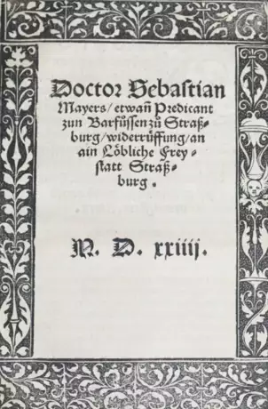 VD 16, M 5121; Schottenloher, Ulhart 53; die Titeleinfassung bei Sammlung Stickelberger Abb. 364-367. Einer von drei Nachdrucken aus dem Jahr der der Straßburger Erstausgabe; selten. - Sebastian Meyer (1465-1551) erwarb in Basel des Grad des Doktors der heiligen Schrift und trat in Bern in den Franziskanerorden ein, wo er als Lesemeister (Lektor) wirkte und die Lehre Luthers als erster Prediger in Bern vertrat. Damit gewann er das Vertrauen des Stadtrats, der ihn vor den Nachstellungen des Diözesanbischofs von Lausanne schützte. 1523 nahm Meyer am ersten Züricher Religionsgespräch teil. Missverständliche Predigten und Aussagen führten dazu, dass der Rat dem Franziskaner nicht mehr wohlgesonnen war und in aus der Stadt wies. Von dort vertrieben, gewährte ihm der Straßburger Rat Zuflucht. In der vorliegenden Schrift wiederruft er in 10 Punkten vorher von ihm gepredigte Lehren von Messe und Altarsakrament, von Buße, der päpstlichen Gewalt, Ablaß, Fegefeuer, Heiligenverehrung, vom freien Willen, von Klostergelübden und Kirchengütern. - Ein Bl. mit Eckausriß (ohne Textverlust). Sehr schönes Exemplar . - One of three reprints in the year of the first edition. Meyer was one of the first, which introduced the reformation in Bern.
