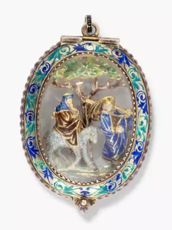 Silber/Glas/Email. Meistermarke HB. Ovale Form, scharniert, beidseitig mit emaillierter Ornamentbordüre. Inwendig plastische Darstellung der Hl. Familie auf der Flucht nach Ägypten. Wiener Stadt-, Meistermarke. Feingehalt 800. 4,5x6,5 cm.
