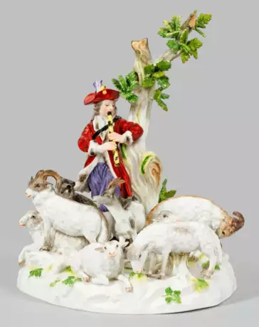 Auf ovalem Terrainsockel an einen Baum gelehnter Schäfer im pelzgefütterten Mantel beim Flötenspiel, umgeben von seiner Schafherde aus Schafen und Böcken sowie seinem Wachhund. Polychrome Malerei. Entw. Johann Joachim Kaendler. Modell-Nr. 1359. Rest.; Schwertermarke. H. 22,5 cm.