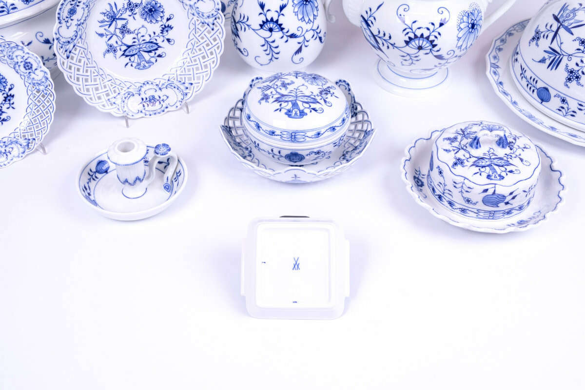 13 pcs., Meissen, 20th century, porcelain, underglaze-blue ''Blue Onion'' décor, comprising coffee pot (H 25 cm), teapot (H 18 cm), butter dish with dome cover (Ø 20 cm), bonbonnière with lid (Ø 13.5 cm), pierced confectionery bowl (Ø 19 cm), pierced plate (Ø 16 cm), large pierced plate (Ø 21.5 cm), small square plate (10.5 cm), large square bowl (27.5 cm, H 10 cm), large serving plate (Ø 33 cm), covered serving dish (Ø 32.5 cm, H 25 cm), tureen (L 37 cm, H 29 cm) and chamberstick; butter dish, teapot, covered serving dish and tureen each with incised line (second quality), all pieces with underglaze-blue crossed-swords mark