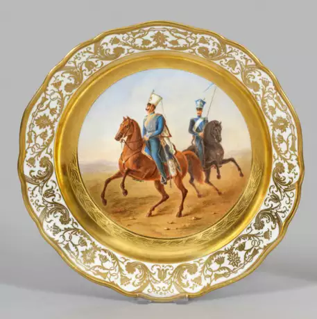 Runde, leicht vertiefte Form mit passig geschweiftem Rand. Im flächendeckenden von einem goldradierten Blütenkranz umzogenen Rund des Spiegels zwei unformierte Reiter eines Husarenregiments. Vergoldetes Steigbord und floral vergoldete Fahne. Rücks. in russisch bez.; "Ober- und Unteroffizier des Husarenregiments". Qualitätvolle polychrome Malerei außerhalb der Manufaktur. Minim. rest.; Schwertermarke. D. 31 cm.