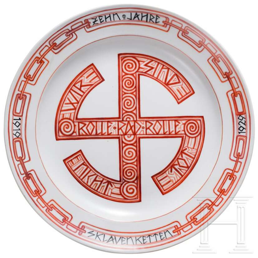 Weißes, glasiertes Porzellan mit rötlichem Dekor, auf der Fahne eine umlaufende Kette mit entsprechender schwarzer Aufschrift und im Spiegel das Sonnenrad mit "Wir sind nicht tot - Rolle Rad Rolle" in Runenschrift. Im Boden die zweifach gestrichene Schwertermarke (3. Wahl) sowie "1929 - 1000 Jahre Meissen". Durchmesser ca. 24 cm.