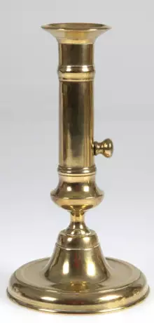 Lot 553 | Messing-Schiebeleuchter, 1-kerzig, gegliederter Schaft auf rundem Fuß, H. 19 cm