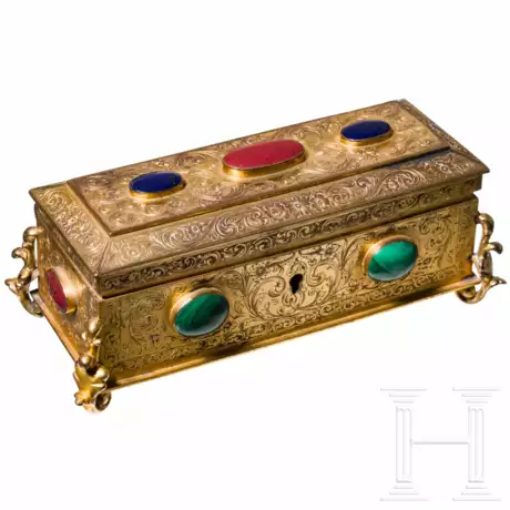 Auf vier plastischen Blattfüßen. Rechteckiger Korpus, mit fein gravierten Blüten und Rankenwerk verziert. Scharnierdeckel und Seiten mit neun Schmucksteinen besetzt. Innen drei Fächer. Mittleres Fach mit Steckdeckel mit plastischem Nasentier-Knauf, Unterseite mit Borsten. Unterseite mit Lochbohrung. Schlüssel fehlt. Ein Stein bestoßen. Maße 14 x 5,4 cm.