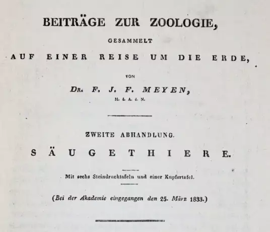 Ein seltenes Werk über Säugetiere des deutschen Arztes, Zoologen und Botanikers Franz Julius Ferdinand Meyen (1804-1840). - Titelbl. fehlt (in Kopie eingebunden), Tafeln gebräunt, Anfang etw. stockfleckig. (78330).