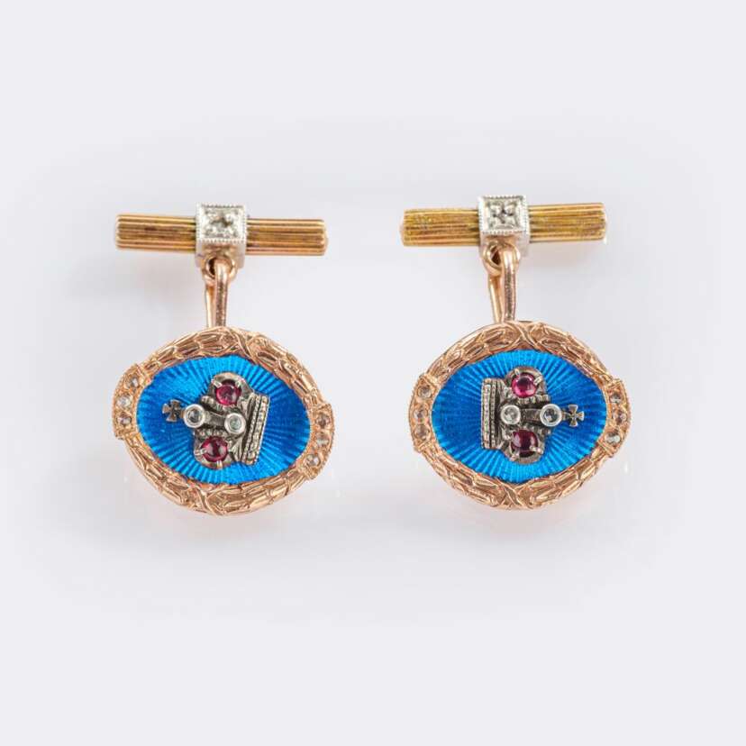 Lot 200 | Michail Perchin (1860 - St. Petersburg 1903). Paar russischer Manschettenknöpfe mit zaristischer Krone und Edelstein-Besatz.