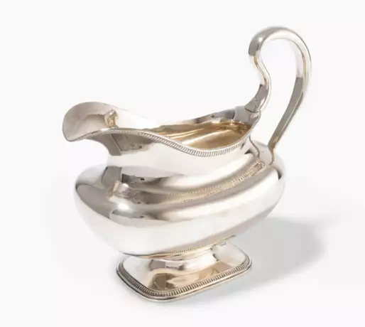 Silber. Werkstatt Rehfues. Korpus mit gerundeten Ecken über eingezogem Fuss. Mit ohrenförmigem Henkel und feiner Godronenbordüre. Werkstattmarke, Beizeichen. H 16 cm, ca. 342 g.