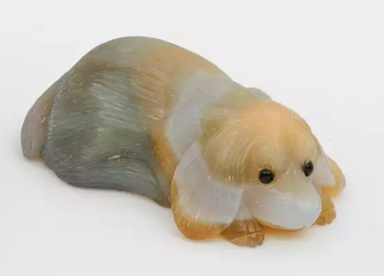 im Stil von Karl Fabergé. Blauer und hell bis sandfarben verlaufender Achat. Vollplastisch und naturalistisch geschnitzte Miniaturfigur eines liegendes Hundes, die Augen besetzt mit zwei dunklen Farbsteinen. Originalbox. H. 1,5 cm. L.4 cm.