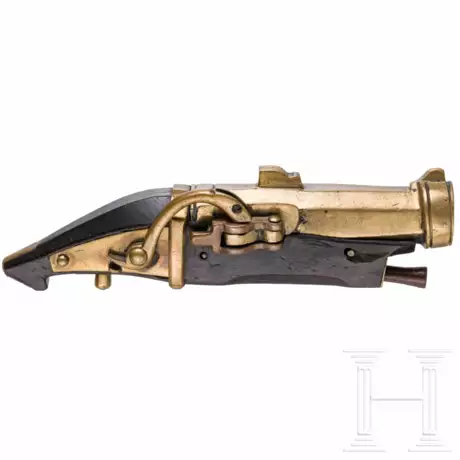 Oktagonaler bronzener Lauf mit aufgesetzter Visierung und verstärkter Mündung. Glatte Seele im Kaliber 6,5 mm. Seitliche Pfanne mit schwenkbarem Deckel. Bronzenes Lunten-Schnappschloss. Dunkle Hartholz-Schäftung mit Bronzegarnitur und eingeschobenem hölzernem Ladestock. In hölzerner Aufbewahrungsschachtel. Länge 11 cm.