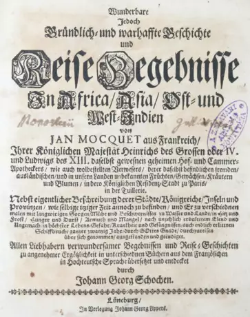Fromm 17841. Sabin 49793. Borba de Moraes II, 66 f. Howgego M 145. Seltene, erste deutsche Ausgabe. - Enth. im zweiten Buch "Eine Reise nach WestbIndien; als dem Strom der Amazonen, die Lande der Caripousen und Caribanen nebenst anderen Landschaften und Insuln im Westen." Die übrigen 5 Bücher behandeln Reisen nach Lybien, Nordafrika, die portugies. Besitzungen in Afrika und Indien. - Die Kupfer mit Darstellungen aus dem Leben der Eingeborenen und der bereisten Länder; wie häuffig, fehlt der gef. Plan v. Jerusalem. - Titel recto u. verso, Frontisp. verso, 1 Taf. u. 2 Bll. gestempelt, gebräunt od. braunfleckig, am Ende kl. Wurmgang, Ebd. etw. fleckig u. berieben, insges. aber noch gutes Ex.