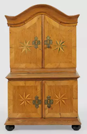 Eichen- und Eschenholz, furniert. Gerader, querrechteckig angelegter Korpus auf gedrückten Füßen. In der gegliederten Front zwei Türen mit Faltsternen. Dahinter Schubfächer. Korrespondierender, zurückgesetzter Aufsatz mit geschweift ansteigendem Giebel. H. 67 cm. 40 cm x 28 cm.