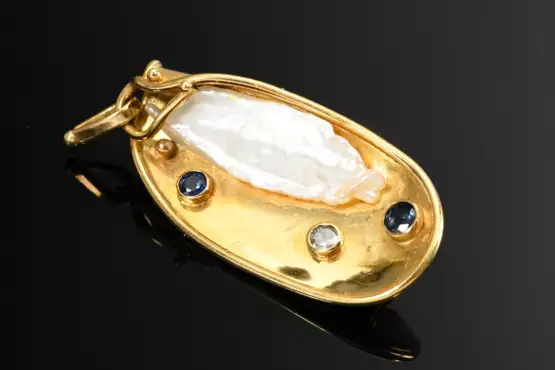Modern 750 yellow gold pendant pin with diamond (approx. 0.06 ct/P1/CR), 2 sapphires and baroque freshwater pearl, 7.5 g, 4.5 x 1.7 cm