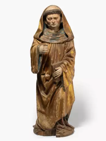 Tirol, 16.Jh. Holz geschnitzt und polychrom gefasst, partiell vergoldet. Auf Terrainsockel stehender Mönch mit Buch (Hl. Bernhard?). Rückseitig abgeflacht. H 68,5 cm.