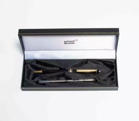 Korpus und Kappe aus schwarzem Edelharz. Kappe mit Montblanc-Stern. Goldfarbene Elemente. Mit Originalverpackung. Beigegeben: 1 Rollerball-Mine. L 13,5 cm.